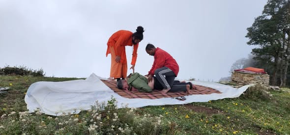 आधे घंटे के उपचार के बाद मुझे एक पांव सीधा रख ध्यान सीखने की अनुमति मिल गई. ध्यान के लिए पहली विधि, आँखों को बंद रख अपनी आती-जाती सांसों पर ही ध्यान केन्द्रित रखें . साथ ही शरीर जो करे, मन जो करे, विचार जो आएं, उन्हें मात्र दर्शक बनकर देखें. यह बताकर बाबाजी समेत हम सभी मौन में चले गए. कुछेक पलों में लगा कि जैसे मैं एक नई आंतरिक दुनियां में विचरण कर रहा हूं. मन का तनाव कम होने लगा. हृदय की गति भी धीमी हो गई. शरीर हल्का और शांत सा होने लगा. इतनी शांति कभी महसूस नहीं की थी. बीसेक मिनट बाद बाबाजी की आवाज से वापस लौट आए. एक बार फिर से मेरे मेरूदंड के साथ नूरा कुश्ती की गई. वापस नीचे को लौटते वक्त बुग्याल में पसरने के बाद पांव का दर्द भूलकर मैं फिर से हिमालय के विराटता में खो गया.