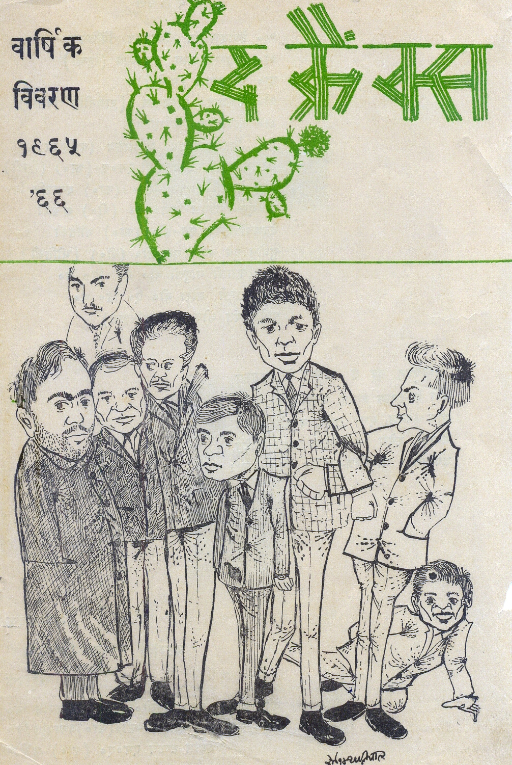 ‘द क्रैंक्स’ – बाएं से: श्याम टंडन, ओमप्रकाश, सईद, बटरोही, देवेंद्र मेवाड़ी, रमेश थपलियाल और जमीन पर नटखट वीरेन डंगवाल (रेखांकन: रमेश थपलियाल). 1965